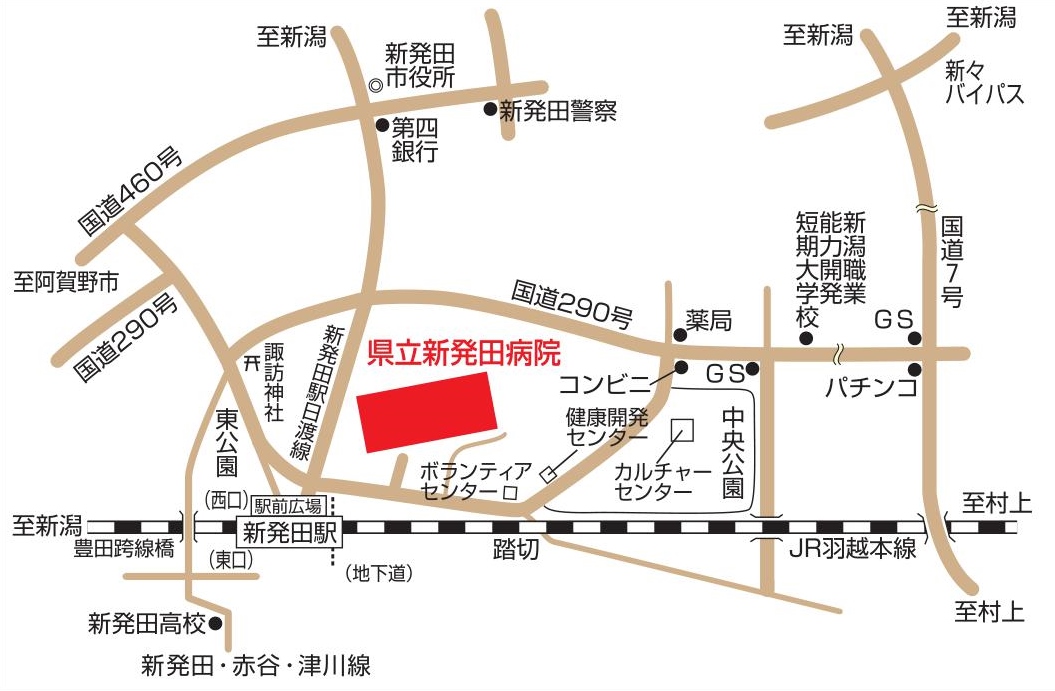 ・新発田駅から徒歩5分、新発田駅の西口を出ると病院が見えます。